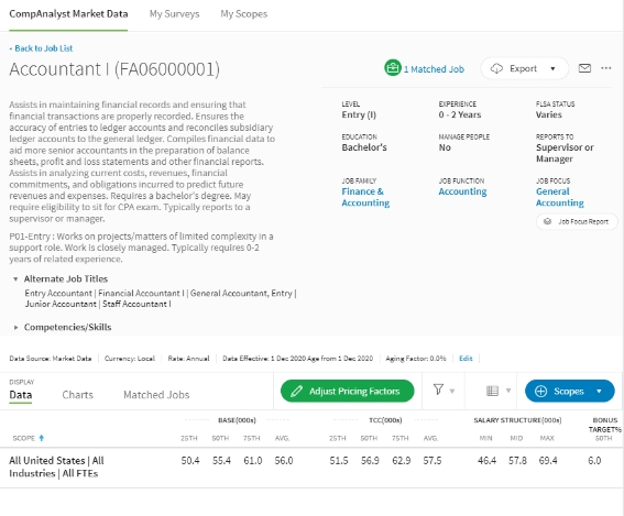 Every Job is Unique: Add, edit, or remove compensable factors such as years of experience, education, skills, competencies, certifications, and licenses from jobs to see impact on job pricing.